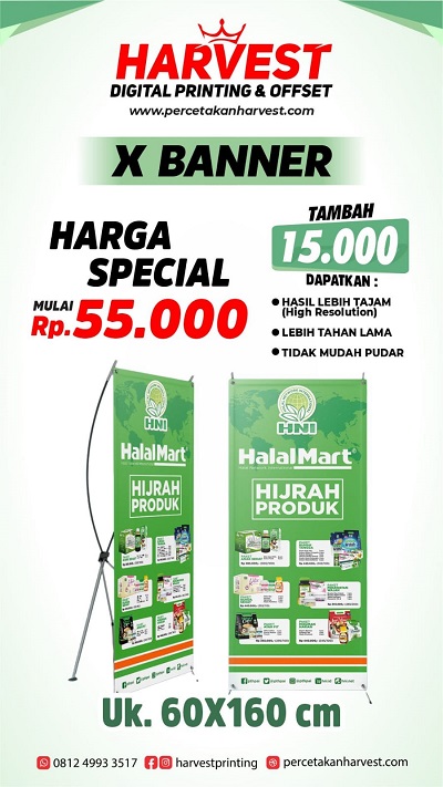 Jika Anda berminat memesannya maka bisa menghubung Printing Harvest. Kami melayani cetak X Banner di Surabaya. Cek penawaran kami di bawah!
