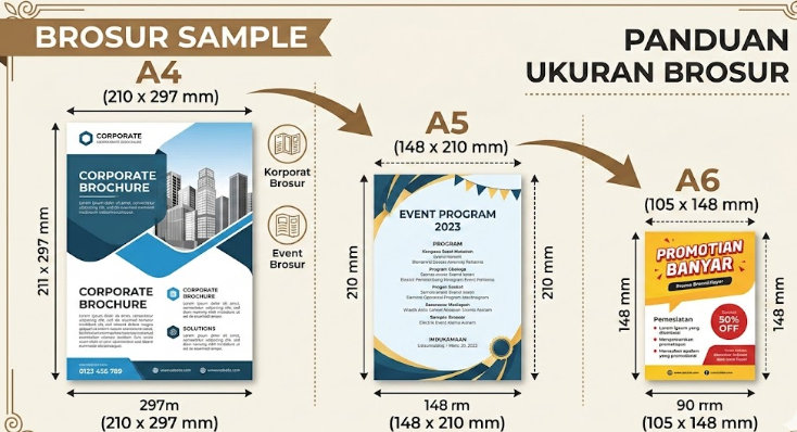 - A4 (210 x 297 mm): Standar paling umum, sangat cocok untuk brosur lipat 2 atau lipat 3 (trifold). Ruangnya sangat lega untuk menaruh banyak foto dan teks penjelasan.